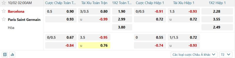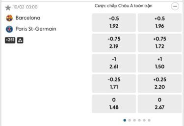 - Tỷ lệ kèo 1×2: Barcelona 2-1 PSG